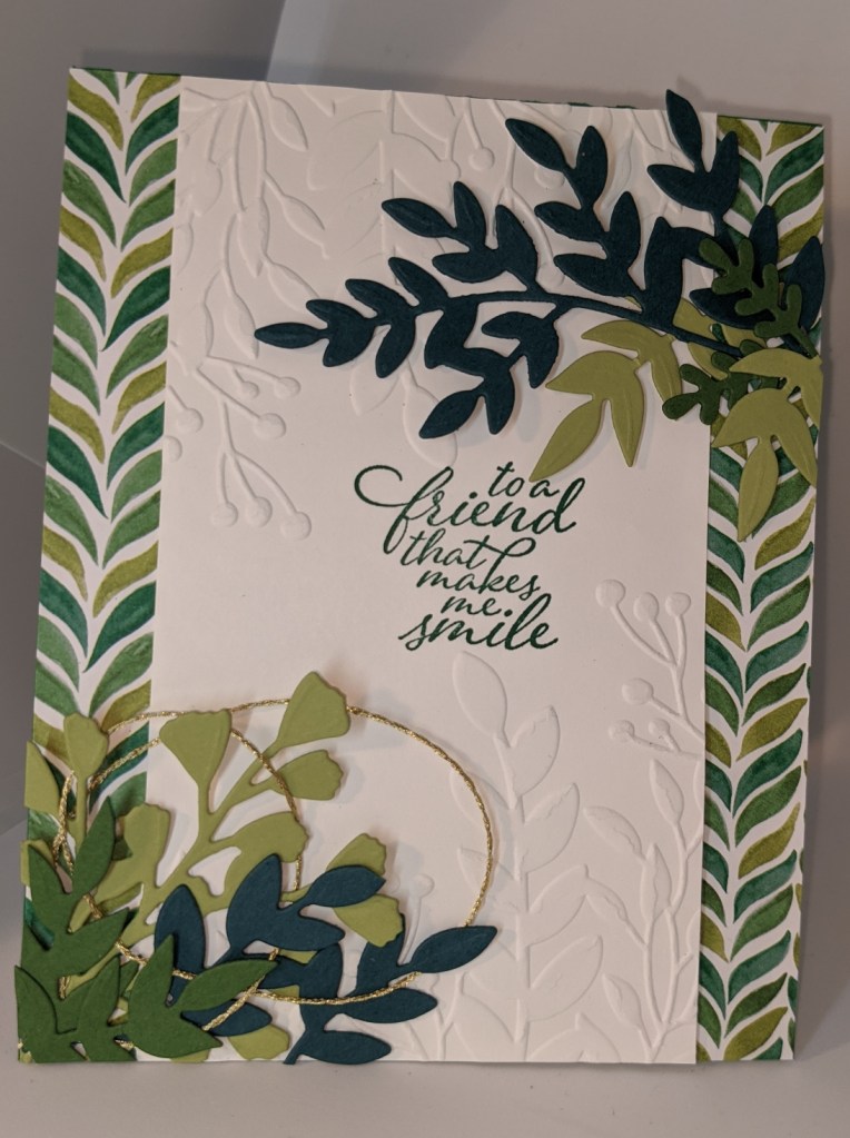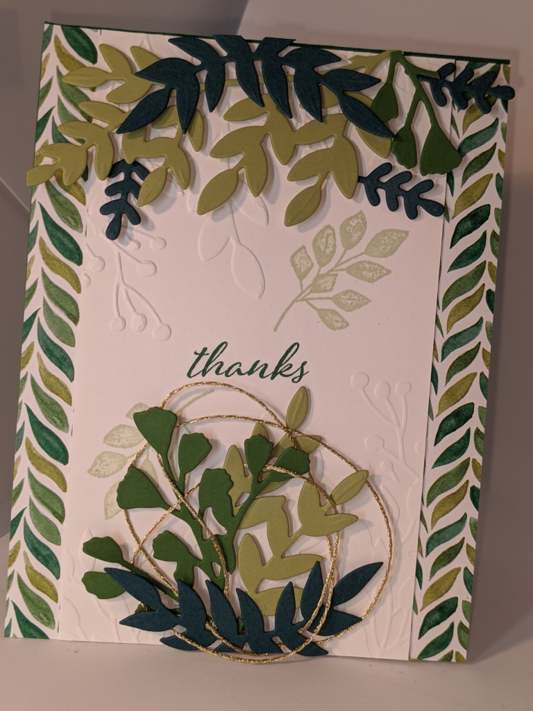 Forever Fern is a new stamp set (with coordinating framelits) by Stampin’ Up! in the new 2020-2021 annual catalog. I love ferns. They are the one thing that flourishes in shady areas, looking luscious green all the time. The coordinating designer series paper shows off many of the greens (Pretty Peacock, Garden Green, Pear Pizzazz, Just Jade, Shaded Spruce, Soft Sea Foam). Included in the suite were the Gold Hoops embellishments, Greenery Embossing folders (2 in the set), and Forever Greenery trim combo pack (very vanilla wide ribbon used in first card, thin Gold twine used in all). All the cards were inspired by the Global Design Project GPD#242 sketch challenge.