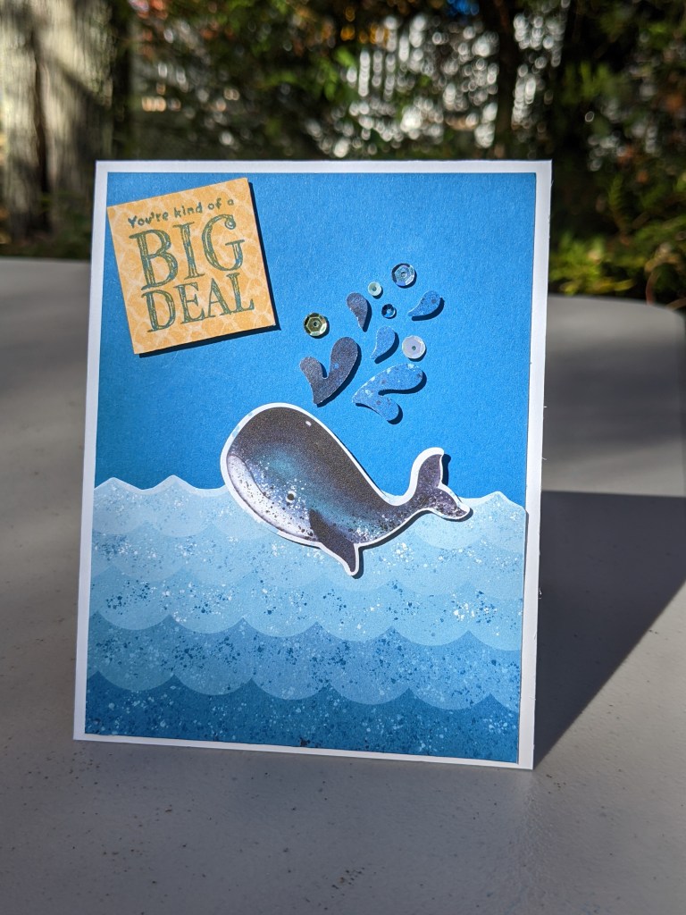 I am on a blue kick. Not a surprise as it is my favorite color. Ombre blues via the whale of a time designer series paper: pacific point, pool party, balmy blue. All Stampin’ Up!: Whale Done stamp set, whale punch, Whale of a Time designer series paper and sequins. The ombre print of the dsp made this card super easy! Even the whale is punched out of the dsp!
