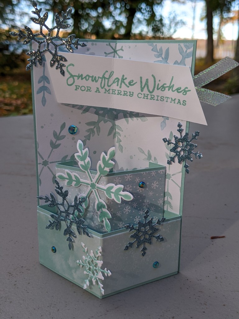 Blue winter holiday colors are my favorite! And I have every snowflake lunch or die set that Stampin’ Up! Has produced. And I never get bored of them! This new stamp set is Snowflake Wishes coordinate a with the So Many Snowflake dies and Snowflake Splendor designer series paper. The snowflakes dies produce thin, delicate, snowflake cut outs. The balmy blue glimmer paper add a little bling, as well as the Blue Gems.