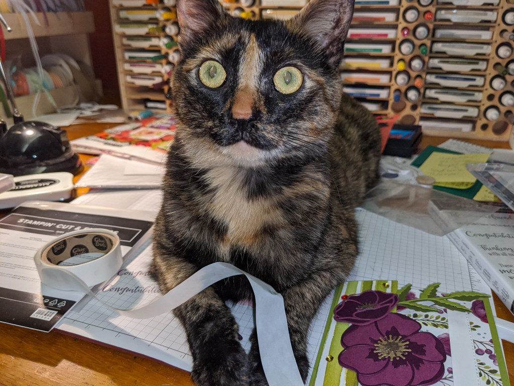 I’m sure many crafters share their craft space with others. I am so fortunate to have Dee, my Crafty Cat! She really is the most unhelpful being, but her little torti cat personality and seemingly painted on nose stripe just melt my heart. She is the prettiest thing, like a work of art herself! I just can’t say “no” when she wants to help with the glue dots or card designs!