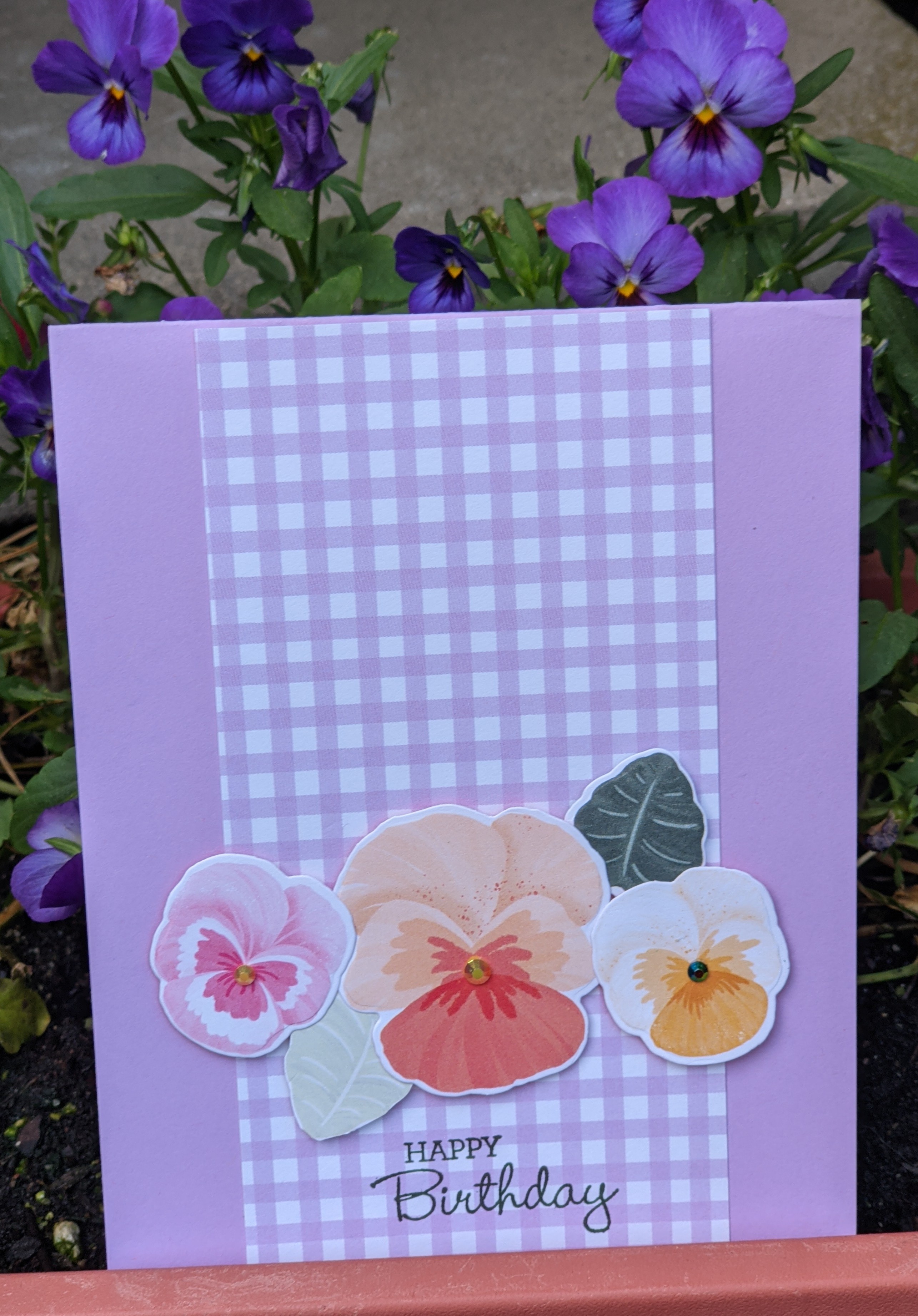 I remember buying vinyl albums and cassette tapes that had a hit song single on it, 1 song on the A-side. I was always excited about what song was on the B-side. I usually liked that B-side track song better than the hit single! With DSP, I have been gravitating towards the showy, flashy, A-side of the paper. The foil side, the flowered side, the side with all the colors. When there is a non-foiled or monochromic design, I hardly pay any attention to it. When I saw the Freshly Made Sketches challenge #492, I instantly thought of the B-side toned down Pansy Petals DSP and a small row of pansies. I turned the sketch on its side for the first card and scooted the DSP over a little bit to be able to stamp the sentiment on the solid cardstock. The others were my prototypes that were pretty much copied from one of the blogs designer team members, Amy O’Neill. I really wanted to create a card (or few cards) in 30 minutes or less, so I went with die cutting the pansies from the DSP instead of stamping the flowers out and die cutting all the pieces. The Pansy Dies make this card fast and easy!!! The sentiment is the from the coordinating Pansy Patch stamp set. I couldn’t resist a quick photo shoot in my very own potted pansies!