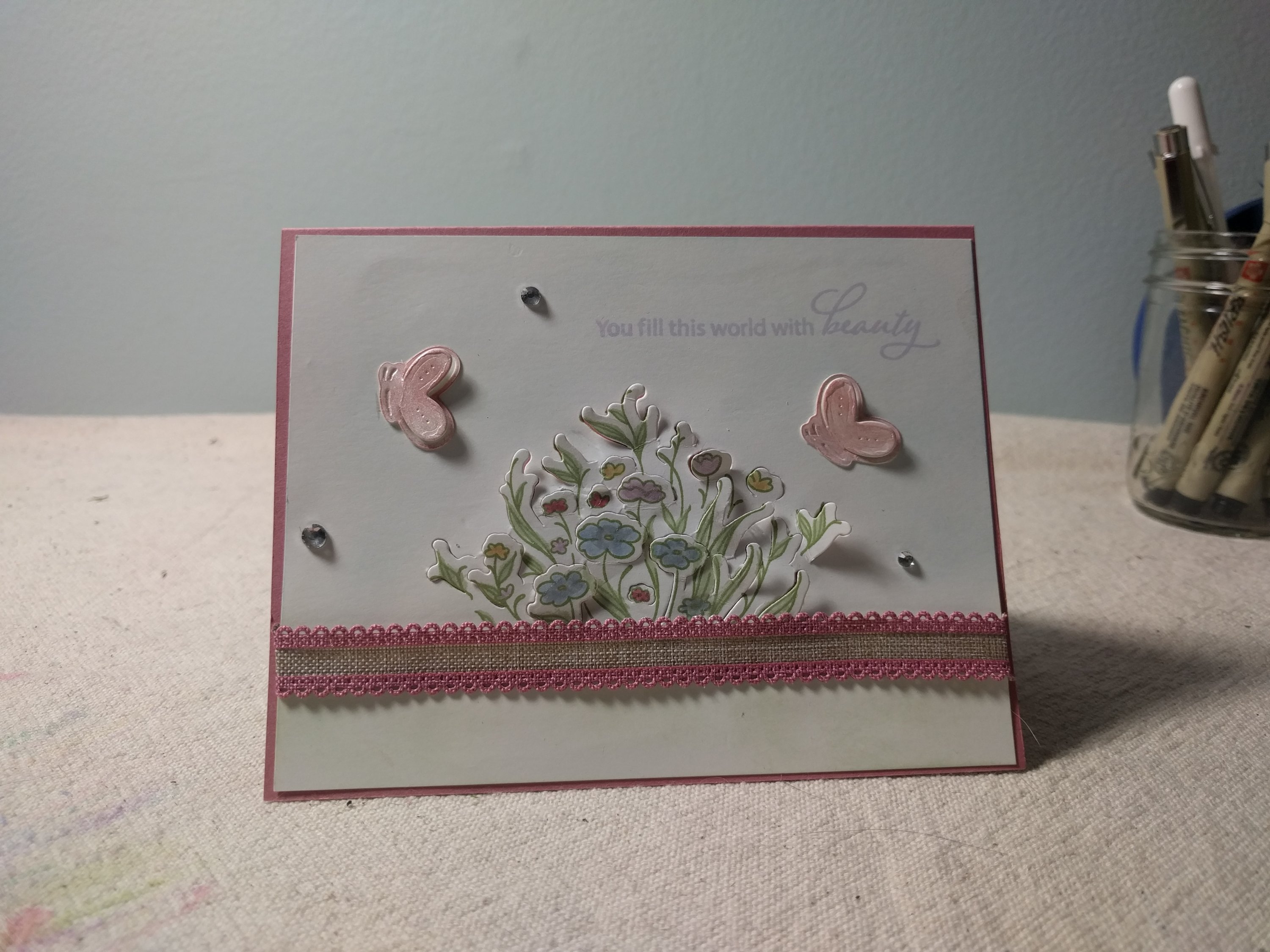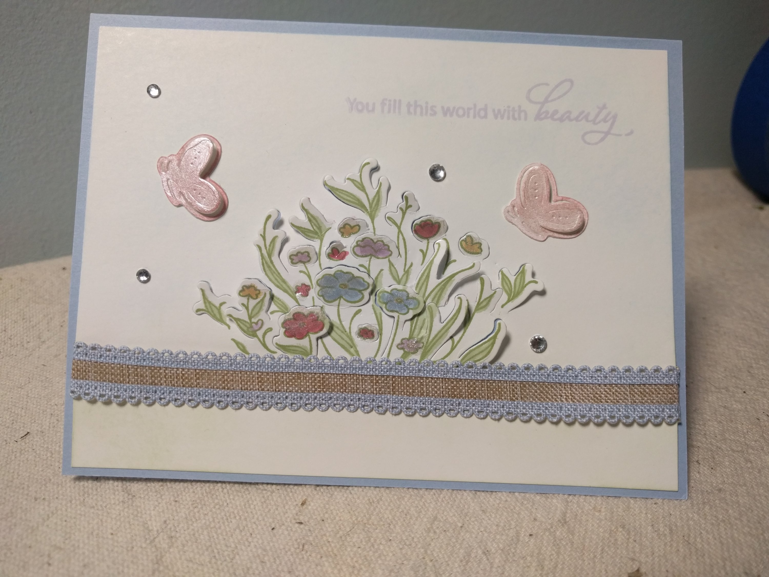 Months ago, I purchased the Lovely is the Day stamp set and Lovely Leaves dies. I was attracted to the way the flowers and leaves could pop up with the dies. It was really easy to work with. Putting dimensionals on the popped up flowers and leaves was the hardest thing.